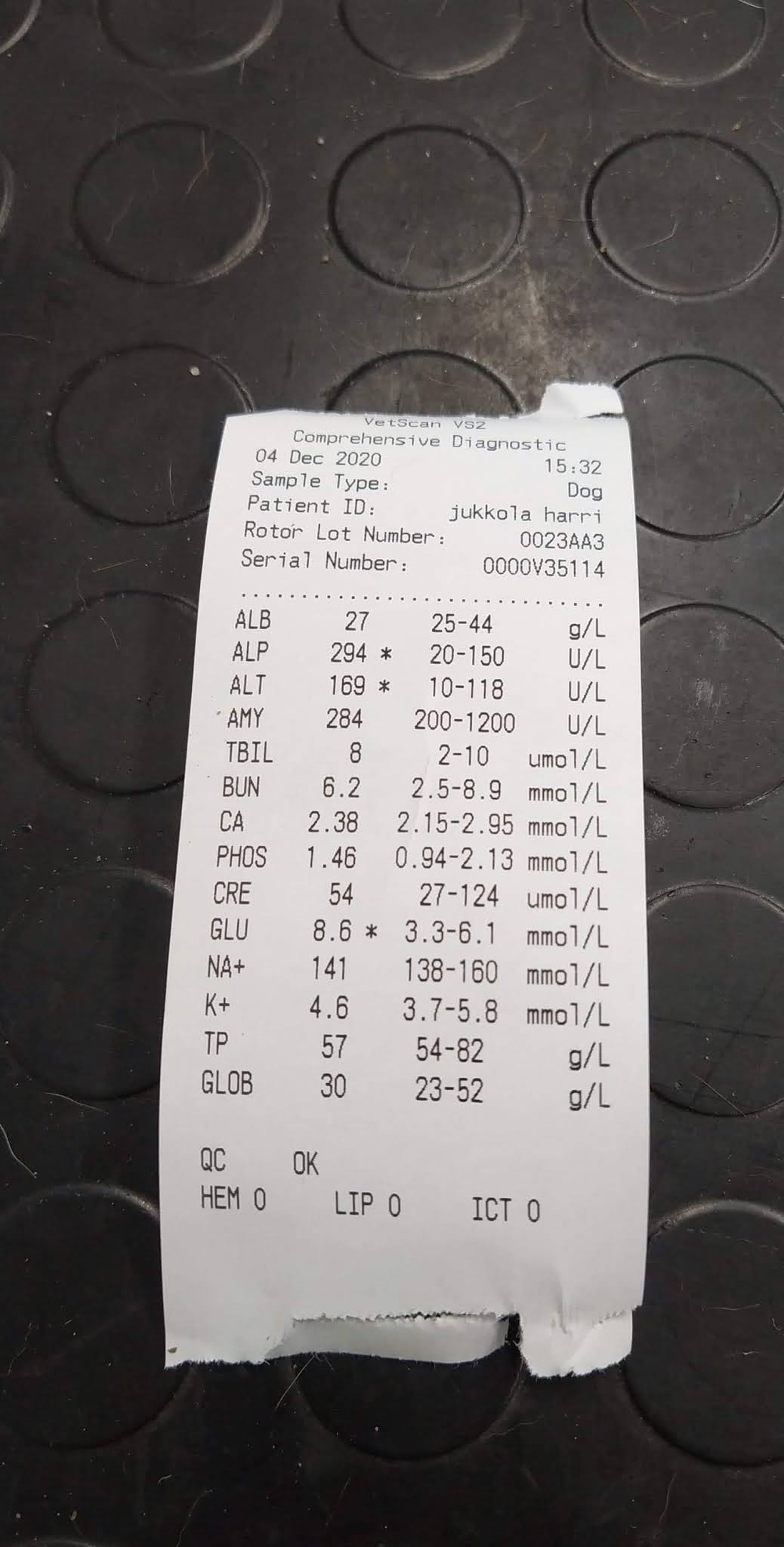 Tiistaina 8.12.20 käytin Nikulan eläinklinikalla Kaustisella Harria, jossa kuvattiin maha ja keuhkot. Kuvista löytyi laajentunut sydän ja maksa vähän myös. Siellä sanoivat että maksan laajentuma ei vaikuta elämiseen mitenkään, mutta sydän vaikuttaa, jos joudutaan nukuttaa joskus. Pitää aina muistaa sanoa sydämestä kun nukutetaan.